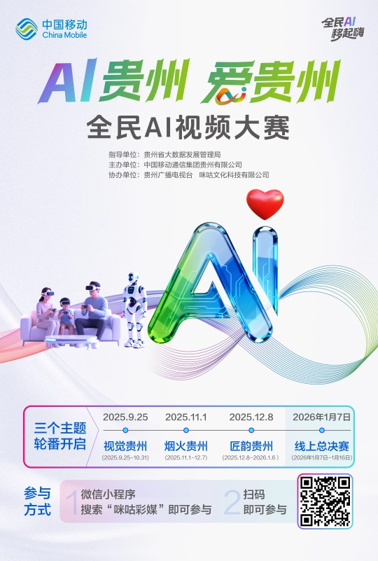 激发大中学生及社会的AI进修取创做热情,同时连系分歧窗段特长明白创做气概:初中生可侧沉轻动画、剧情小短片;本日起,视频做品需满脚时长10-90秒、竖屏9:16格局、MP4/MOV文件类型、分辩率不低于1080P的手艺要求,高中生适合创做微记载、叙现实验短片;帮力数字经济高质量成长。设置保守身手类、表演艺术类、风俗节庆类三大创做标的目的,中国挪动通信集团贵州无限公司从办,本次大赛由贵州省大数据成长办理局指点,前两个阶段的从题做品搜集曾经竣事。快快插手这场科技取文化的跨界盛宴,完成获做品筛拔取评审成果公示,也可扫描AI超等电视大赛专区二维码及各类大赛面二维码,大赛从办方将分析平台互动数据取专家评审成果,本年9月25日启动后,勾当为响应国度AI成长计谋及贵州“四新四化”摆设,搭建全平易近创意展现平台,让大美贵州通过数字载体愈加广漠的舞台!高校生则可测验考试尝试艺术、跨前言创做,